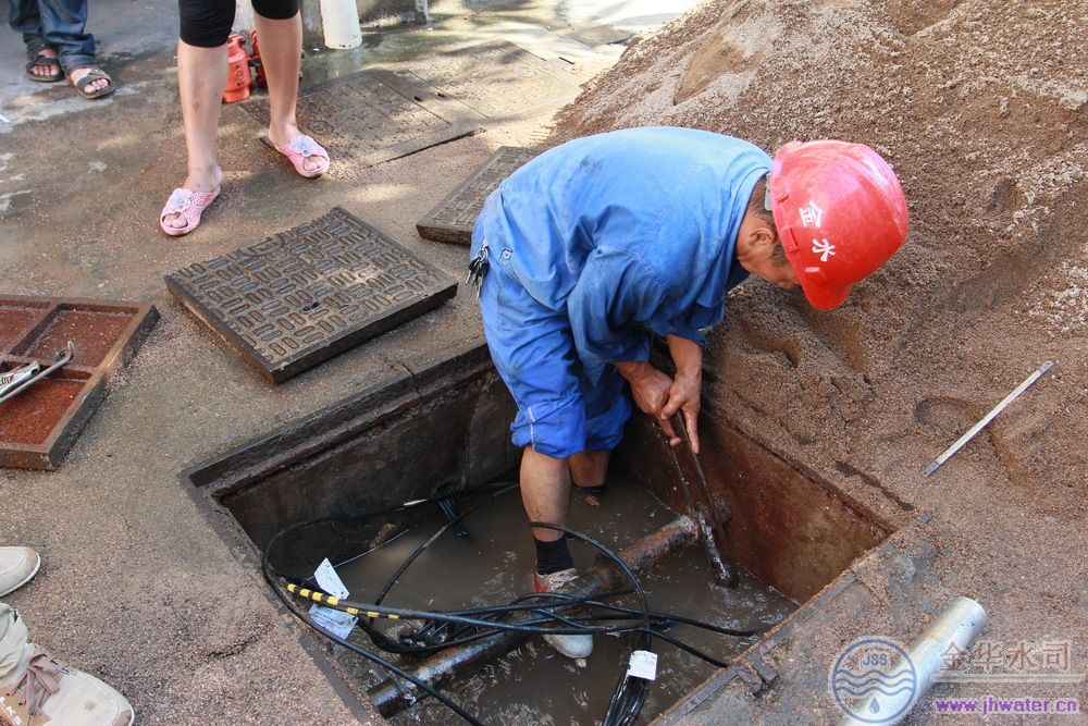 抢修中心立即调派杨银法、李红春两位师傅赶赴现场。当他们冒着高温到现场后已是汗流满面,但他俩顾不上歇息,立即查看事故原因。原来,有一辆货车车轮压破了宿舍楼下的窨井盖,车辆陷下去压坏了窨井内的dn50自来水管,顿时清澈的自来水喷射而出。