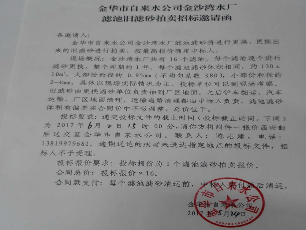 金华市自来水公司金沙湾水厂滤池滤砂将进行更换,更换出来的旧滤砂进行拍卖,按最高报价确定中标人。