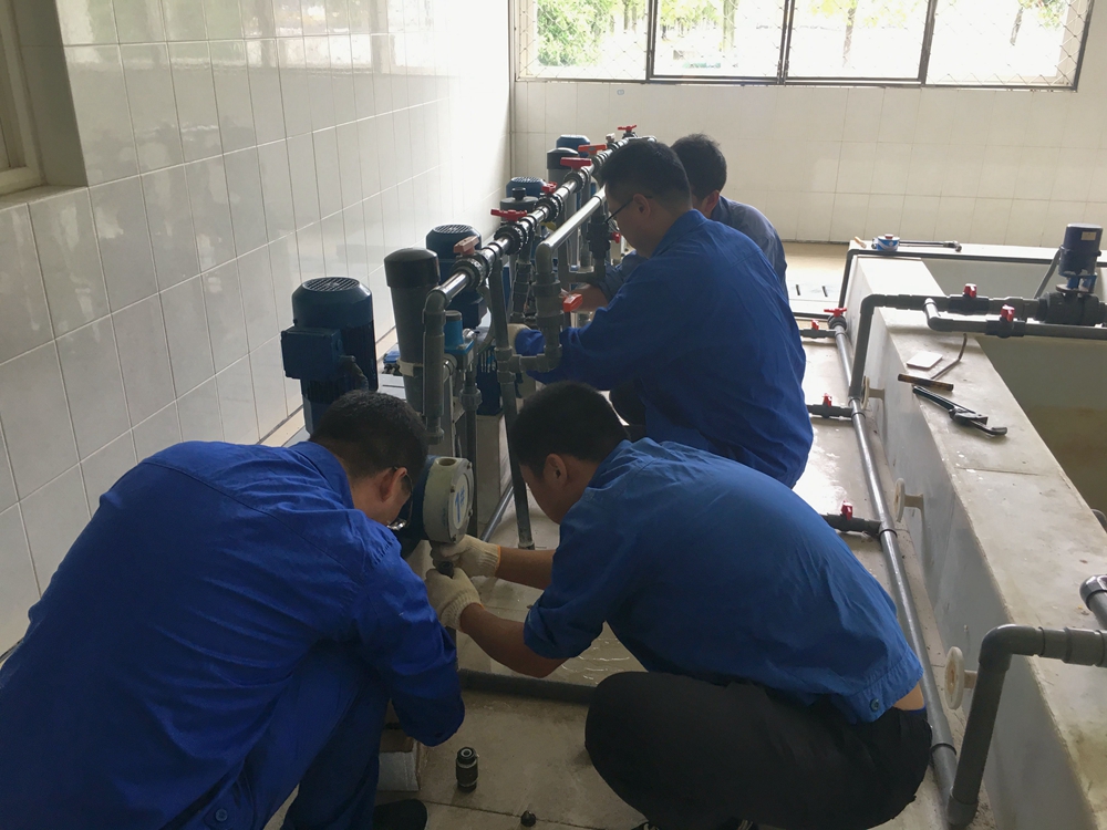 夏季气温高,容易出现藻类爆发、ph值升高等水质问题,金沙湾水厂安排机修人员对加碱投加计量泵进行检修,添加齿轮油、清理背压阀、检查电机运行情况、更换轴承及单向阀……经过一系列的检查、维护,四台投加计量泵两用两备,投入使用。另外,由于部分投加管路已出现老化现象,根据生产实际,进行管路更换。