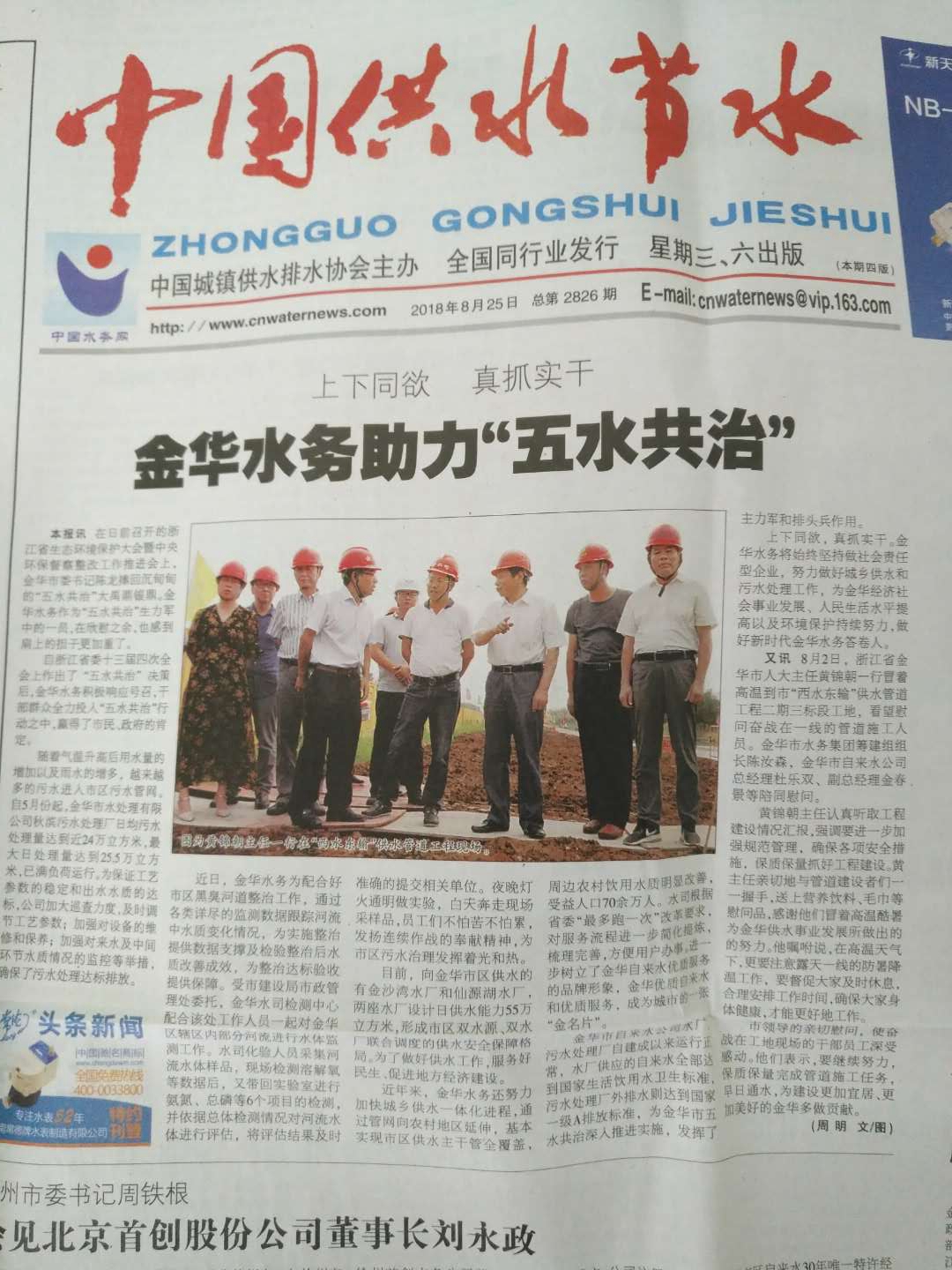 日前,公司在“五水共治”工作中做到上下同欲,真抓实干,取得了明显的成效。《金华水务助力“五水共治”》的新闻稿被行业权威媒体《中国供水节水》采用并在2018年8月25日头版头条发表。